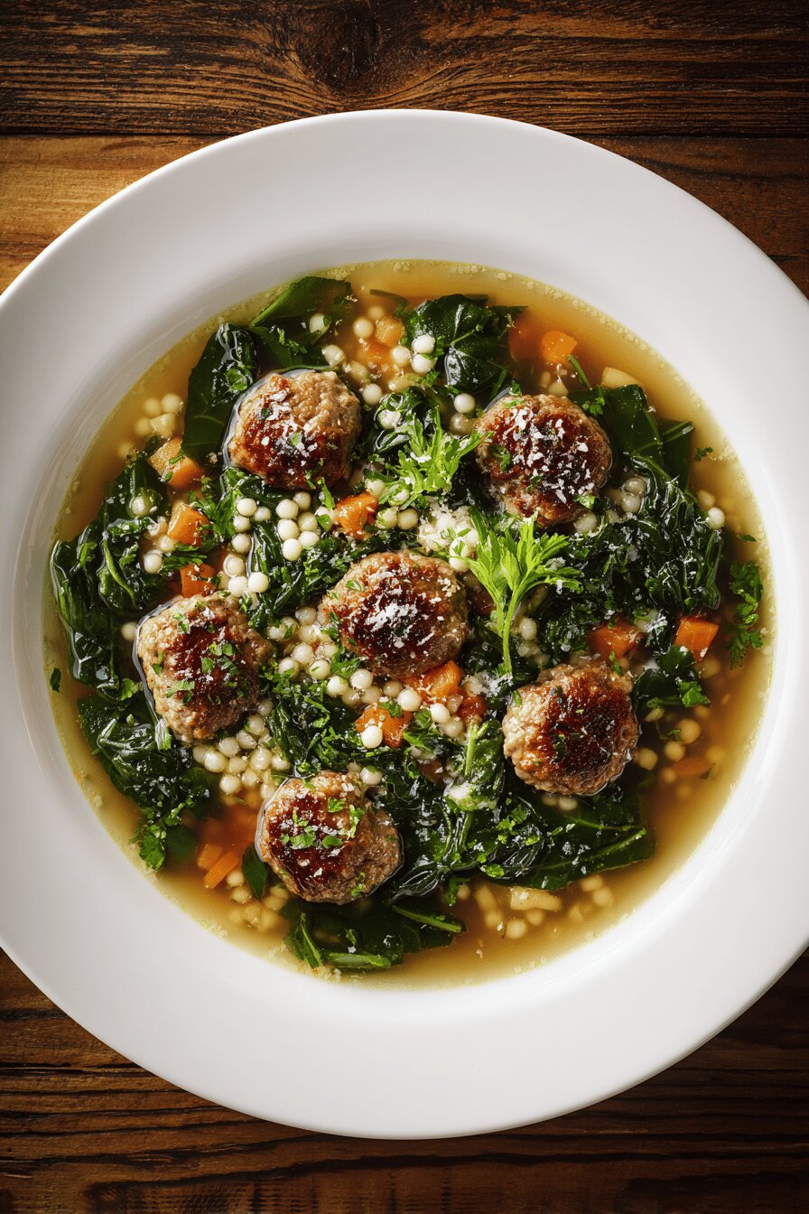 A rustic Italian Wedding Soup variant. Combines pork, veal, and beef boulettes with fresh herbs, a mix of chicken and vegetable broth, fresh spinach, and lemon juice for brightness. Small pasta pearls cook until just tender. Parmesan rind simmers to enrich broth. Aromatics sweated just right; boulettes browned in batches to avoid steaming. Adjust herbs and spice to taste. Swap orzo for fregola or tiny elbows. Guidance on texture cues, avoiding overcooked noodles and dry meatballs. A home cook’s approach that prioritizes hands-on techniques over timing, flavor balance with acidity and savory meld. Simple, flexible, forgiving.