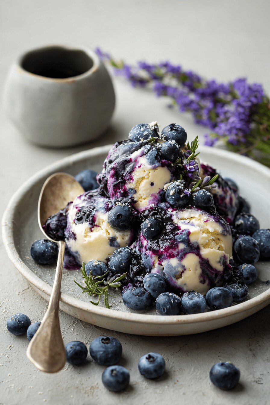Cream and whole milk with at least 35% fat give that rich mouthfeel—skimp here, ice cream turns icy and dull. Dried lavender flowers are key, fresh can be too pungent; if unavailable, substitute with 10 ml dried chamomile for mild floral note. Agave syrup substitutes honey; use if honey’s too strong or you want cleaner taste. Arrowroot powder replaces cornstarch for better clarity and texture, though cornstarch can work in a pinch—use half quantity. Wild blueberry preserves bring texture, sweetness and natural color—can swap with raspberry jam or black currant preserves depending on the season. Fresh blueberries can’t substitute well here due to freezing and texture issues. Avoid artificial flavors; flower bitterness comes from over-extracting, not the herb itself.