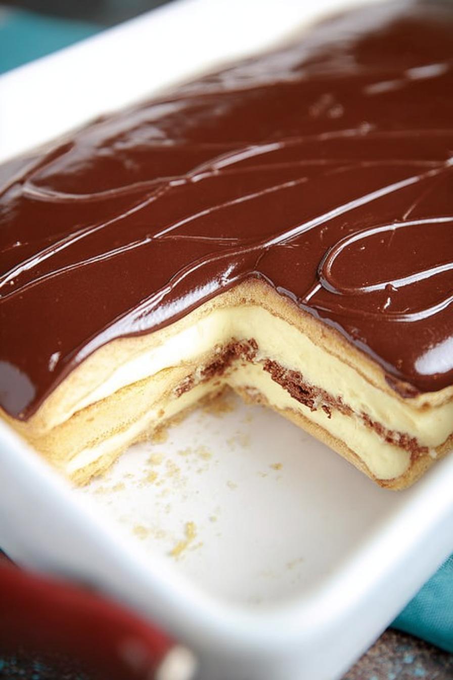 Classic layered dessert with pudding folded into whipped topping, stacked between graham crackers, topped with melted chocolate fudge icing. Adapted with altered ingredient amounts and swapped vanilla pudding for chocolate instant pudding mix. Uses coconut whipped cream instead of traditional topping. Layers assembled in 9×13 dish, icing melted gently and poured over top. Chilled until fully set. Approach focuses on textural contrasts, timing cues, and handling delicate cracker layers without sogginess.