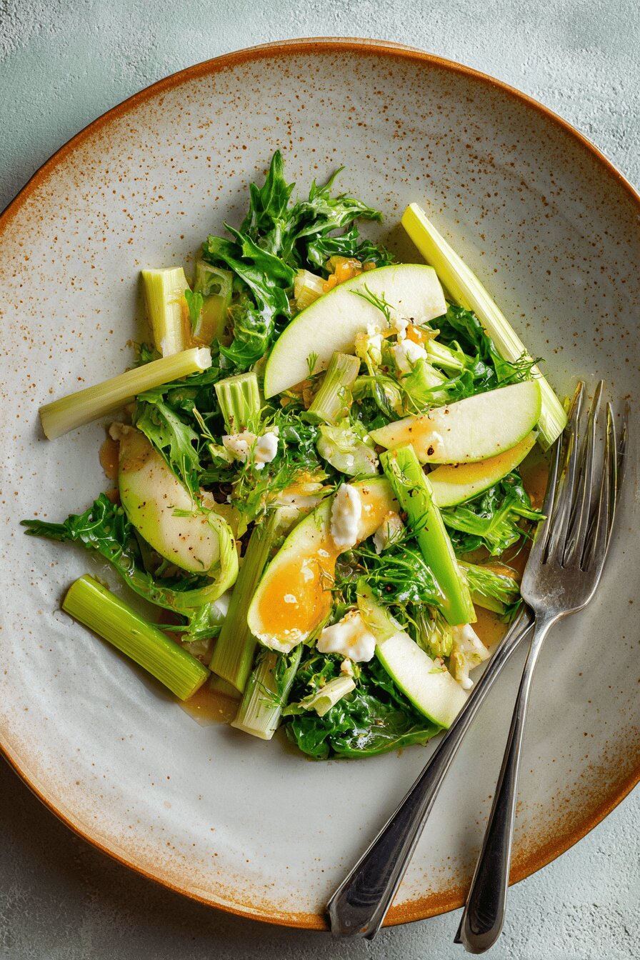 Leeks coaxed into softness without losing shape; celery kept crispy but tender. Braising in stock infuses background flavor, aromatics lift it subtly—the thyme woody, bay leaf slightly bitter, clove warming. The vinegar-broth reduction cut by egg yolk and oil brings balance; the dressing clings to the vegetables, enriching their humble texture. Crisp green apple slices break monotony—fresh acidity, juicy snap, a little sweetness. Swap chicken stock for vegetable if vegan or skip clove if unfamiliar. Keep an eye on the broth reduction; too thick turns pasty and too thin dilutes flavor. Timing reluctant; feel the stalk give and leaf soften before pulling from the oven. Don’t overdress. This starter is smart, restrained, but layered. No fuss. No excess. Just technique.