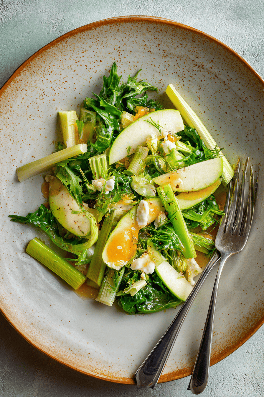 Poireau and celery gently braised with herbs in chicken broth, then tossed with a sharp cider vinegar reduction vinaigrette with Dijon and egg yolk. Crisp green apple slices add a refreshing crunch. Cooking focuses on tender vegetables, reduced flavorful liquid, and well-emulsified dressing. The dish is served cool or slightly warm as an elegant starter without gluten, nuts, or dairy. Variations include swapping chicken broth for vegetable stock and celery for fennel to brighten flavors. Visual and tactile cues guide doneness more than exact timing.
