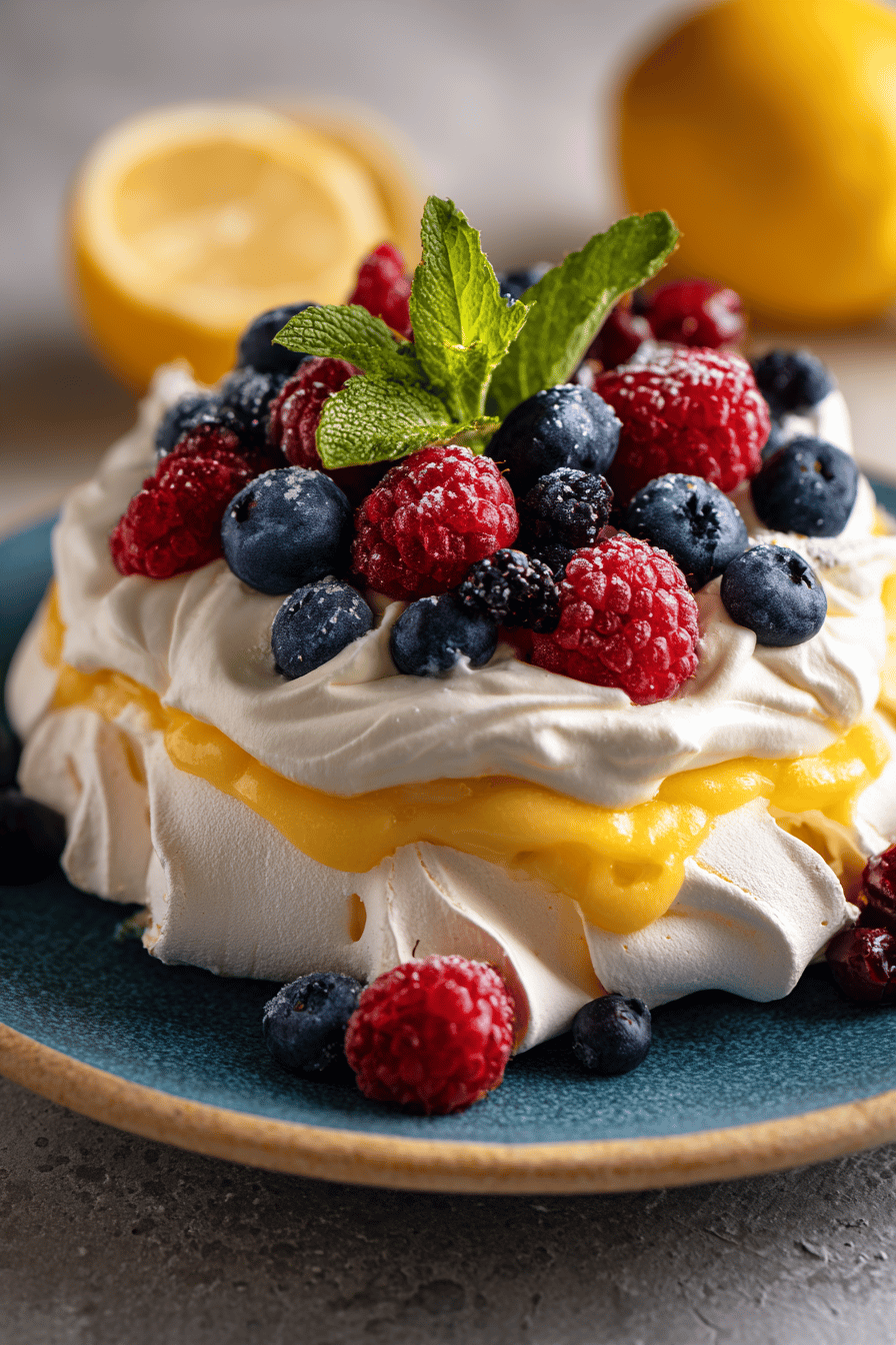 Crisp meringue shell baked low and slow until slightly golden, dehydrated to crackly perfection. Tangy lemon filling thickened with arrowroot and orange zest replaced butter for a fresh, bright note. Egg whites whipped with cream of tartar and powdered sugar, creating stable peaks. Lemon custard cooked gently over a simmer reducing risk of curdles, then chilled till thickened. Assembly with seasonal berries adds freshness and texture contrast. Classic Pavlova with thoughtful swaps to avoid nuts, gluten and lactose, but enriched with citrus and subtle spice.
