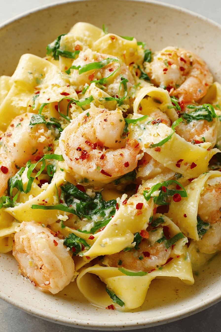 Wide ribbons of pasta tossed with fresh northern shrimp in a lemony, spiced cream sauce with shallots and dill. Adjusted quantities with tarragon swapped for dill, half-and-half replaces heavy cream. Zesty, slightly smoky from chile flakes. Recognizable sharp citrus aroma, tender shrimp finish, with pasta al dente holding bite. Quick, confident method focusing on layering flavors without overworking. Simple, bright, creamy, with subtle heat and fresh herbs balancing fat and acid.