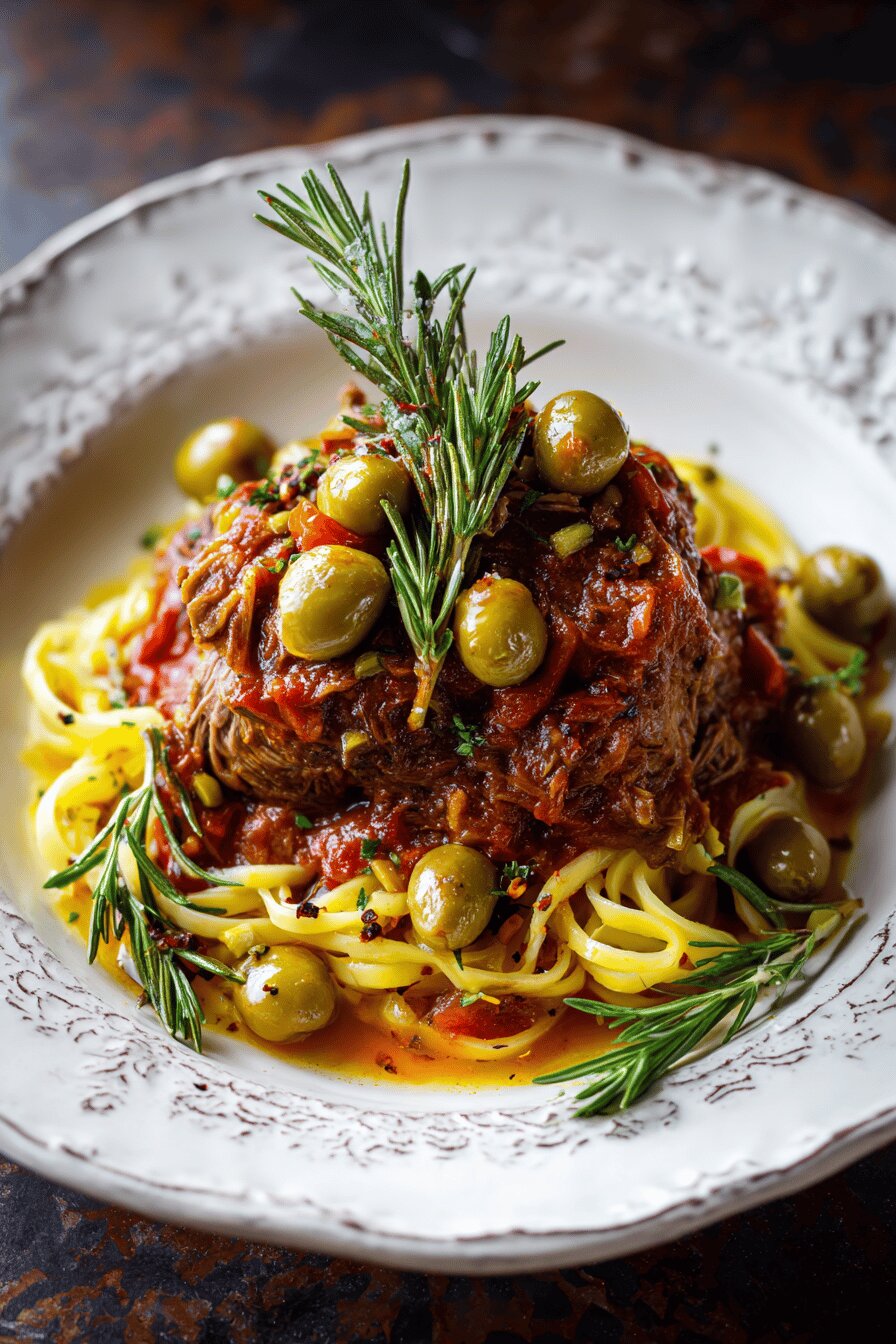 Lamb shoulder trimmed is key, fat left helps keep moist but trim bulky chunks for even cooking. Oil must be good quality olive oil; virgin but not extra heavy flavor to not overpower lamb. Shallots chosen over plain onions for their mild aromatic profile that blends well in slow-cooked sauces without harsh edges. Crushed San Marzano tomatoes bring authentic Italian acid-sweetness; can swap canned plum tomatoes but crush them. Beef stock adds body, vegetable stock can substitute for lighter versions though less depth. Slightly salty green Castelvetrano olives add a mild fruity brine; dry black olives usually bring more bitterness – adjust accordingly. Rosemary optional but adds layer of herbaceous pine that wants slow slow cooking to release. Chili flakes bring heat balance without dominating. Linguines standard but tagliatelle or fettuccine can work if easier for you. Ingredient ratios tweaked slightly for proportional balance but adaptable depending on taste or pantry.