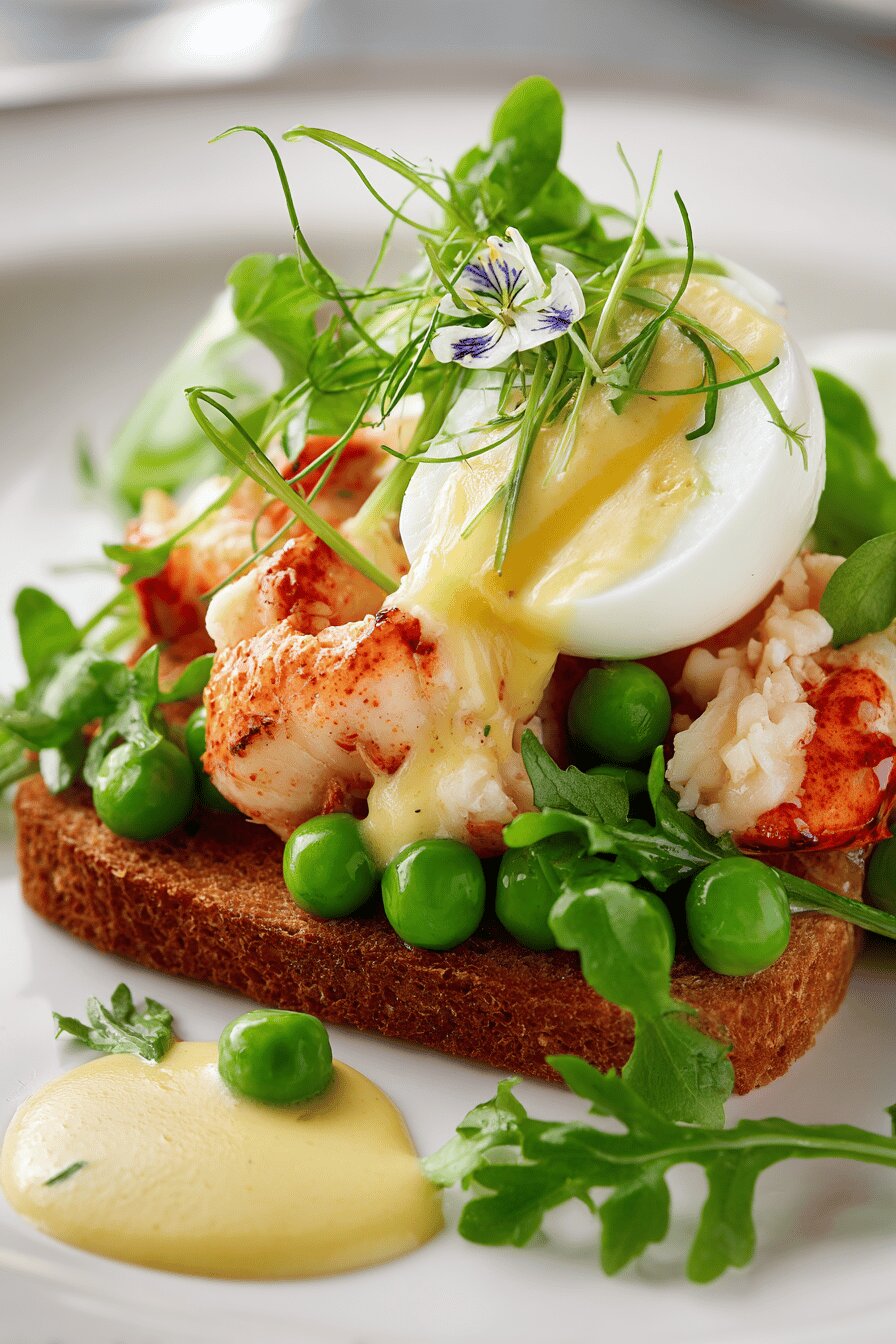 Swapped traditional oil for grapeseed oil – lighter flavor, less overpowering. Added lime juice rather than lemon in salad to brighten differently. Tarragon remains but smaller portion, balancing freshness. Chives folded into hollandaise for a herbaceous twist. Butter trimmed to 150g from 170g, slightly less heavy but still rich. Peas reduced a bit to 120g making salad less bulky. Using brioche instead of English muffins optional, adds slight sweetness laying under warm lobster and eggs. Eggs steamed 11 minutes to finish with a medium firmness yolk, rather than 10 minutes. Lobster size trimmed to 600 g from 675 g; visually balanced without excess richness. These quantities serve 4, plate arranged for impact but ease.