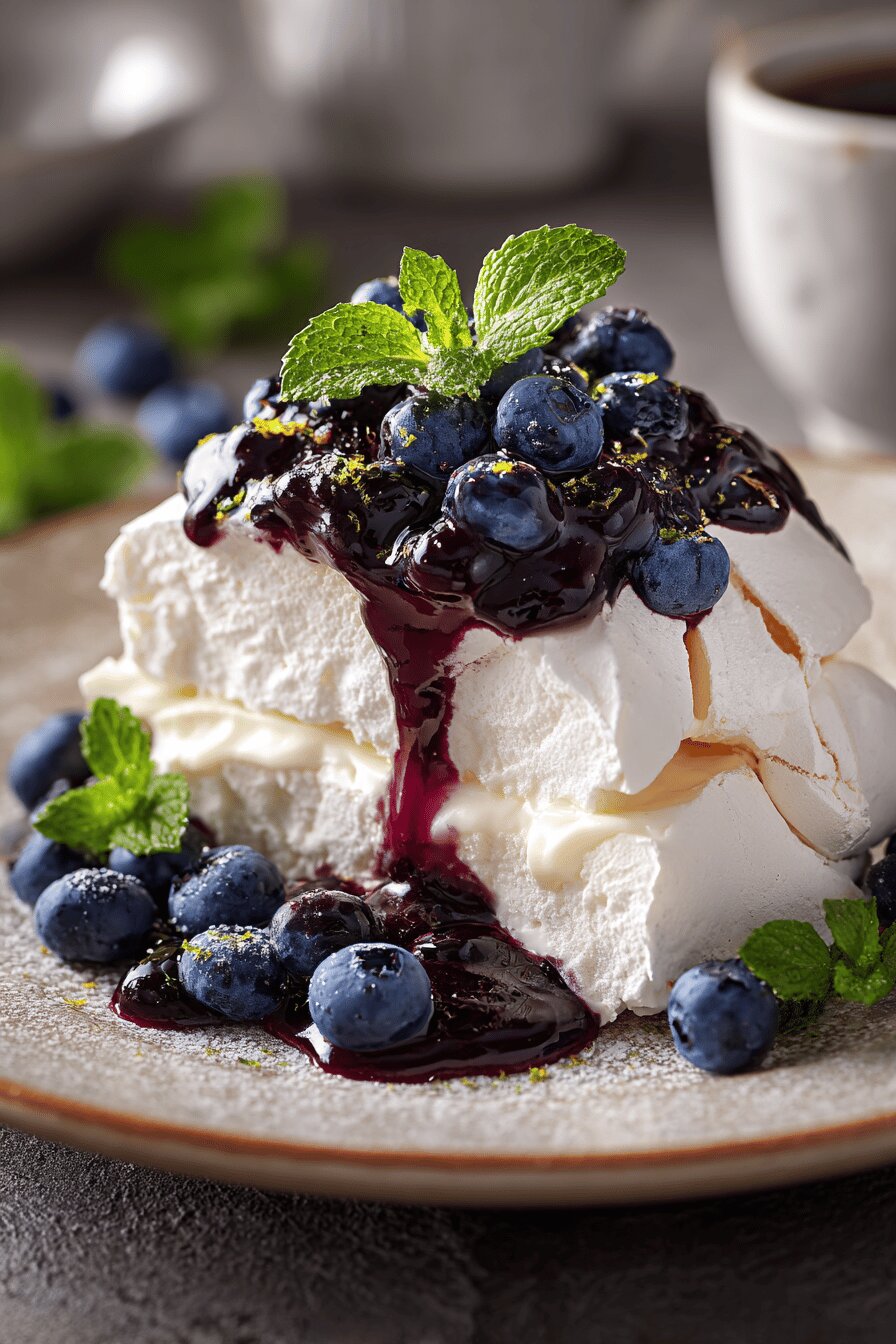Meringue demands patience — slow adding sugar dissolves crystals, encouraging glossy peaks. Folding starch prevents sugar leakage, stabilizes foam. Oven low and steady dries without browning, cracking due to sudden heat changes. Cooling in closed oven finishes drying without cracks, happens less if oven door is opened. Custard thickens when starch swells; scald milk slowly to prevent lumps and overcooking eggs. Straining custard removes grainy bits—skip and risk gritty mouthfeel. Cook blueberry compote till syrupy but berries still intact — mush kills contrasting texture. Whipping cream last avoids overmixing. Fold cream gently to preserve volume. Assembly quick to keep pavlova crisp. Serve soon or bring back crisp using low oven heat briefly.