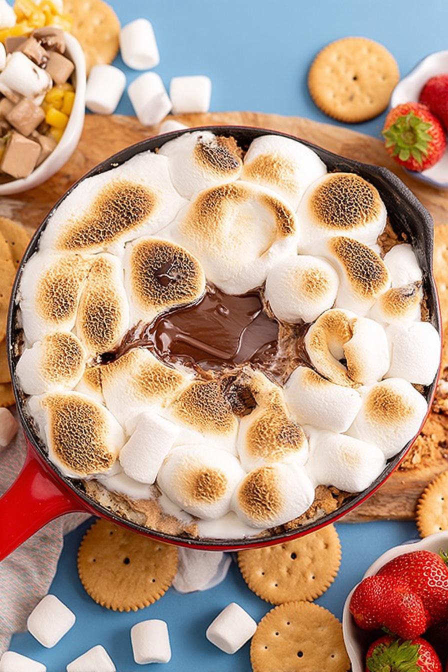 Use bittersweet chocolate chunks instead of milk chocolate chips; chunk shape melts more evenly and controls viscosity in the pan. Mini marshmallows toast faster and spread flavor nicely vs jumbo which can burn outside and leave cold goo inside. Cast iron skillet is best—retains heat, prevents quick burn. Substitute with oven-safe ceramic if unavailable but expect slightly different heat distribution, requiring closer watching. Dippers matter. Cinnamon cookies add spice contrast; graham crackers are traditional but can feel plain. Strawberries or dried pineapple introduce acidity cutting richness. If allergic to gluten or prefer paleo, use nut-thins or fruit slices. Avoid low-quality chocolate with stabilizers; melts tough and greasy. For less sweetness, try semi-sweet or 60% dark bars chopped. Avoid pure baking chocolate – lacks sugar so marshmallow dominates.