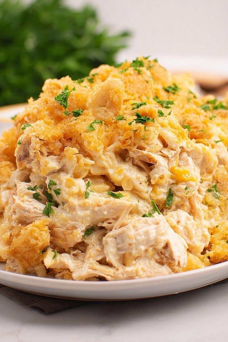 Cream cheese blended with ricotta, sour cream, and a creamy soup base coats shredded chicken. Mozzarella tops the mixture. Ritzy cracker crumbs mixed with browned butter finish the crust, baking into a golden crunchy layer. Adapted with Greek yogurt for tang, cheddar instead of mozzarella, and cream of mushroom soup swapped in. Oven set slightly lower for even melting. Total bake time nudged up for bubbling and browning cues. Garnish fresh parsley at the end. Serves six.