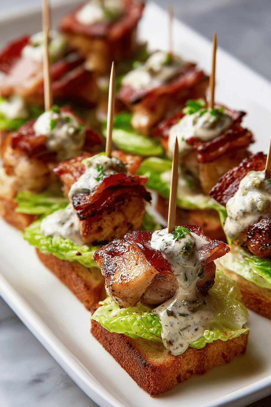 Small bites of chicken thigh and bacon stacked on toasted bread with romaine, dressed in a mayonnaise-based Caesar vinaigrette flavored with anchovy paste and capers. Pops of salty, crisp, and creamy in handheld form. A practical appetizer using common pantry ingredients, modified for texture and layering.