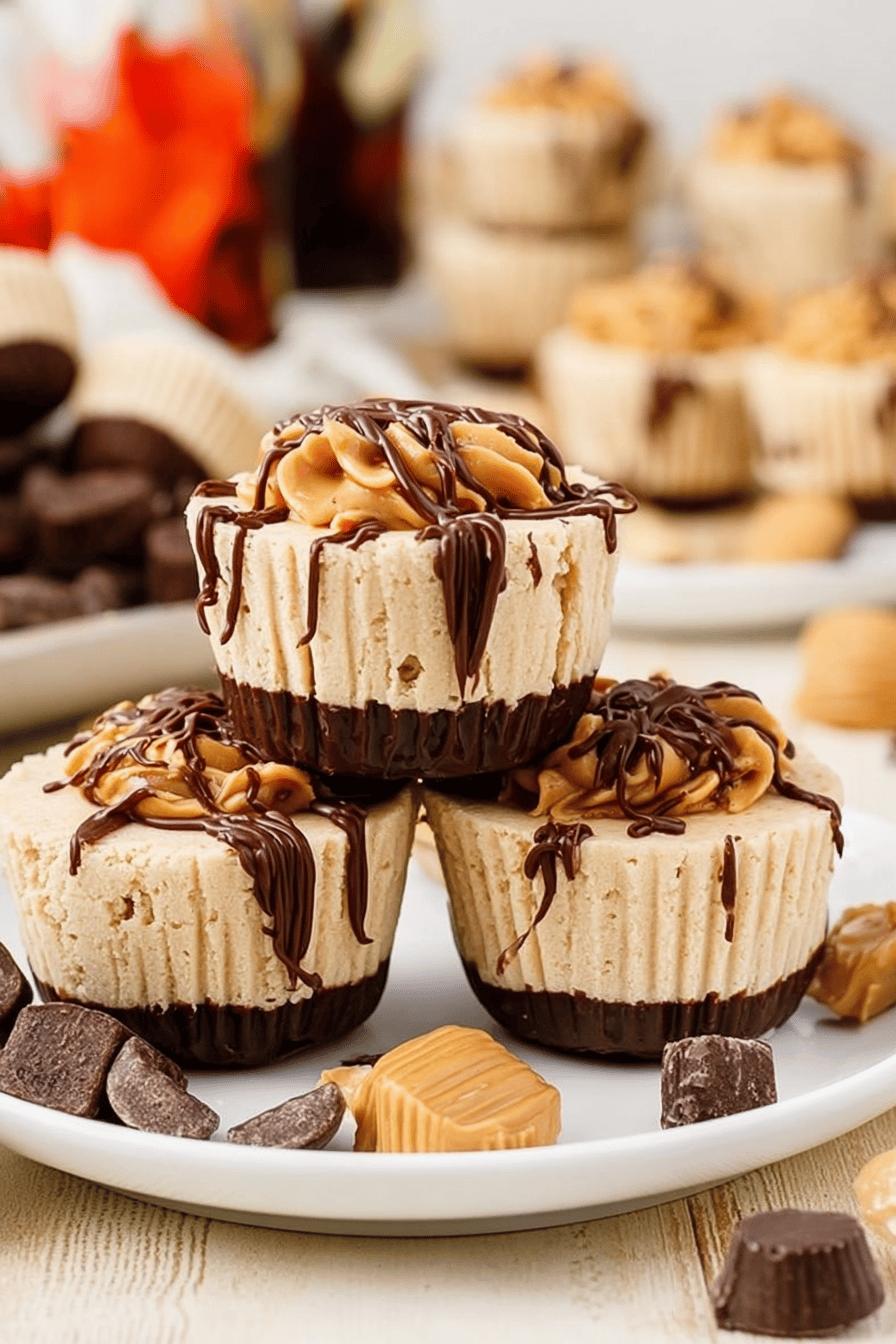 Individual peanut butter cheesecakes with a Reese’s cup base, whipped cream cheese and peanut butter filling, topped with a mini Reese’s and chocolate drizzle. No baking required. Chill until firm. Uses cream cheese and peanut butter for rich texture. Powdered sugar sweetens, vanilla and heavy cream for lightness. Easy to pipe; chilling crucial for structure. Swapped mini peanut butter cups for Reese’s Pieces; replaced heavy cream with coconut cream for a slight twist. Yields 12 servings with rich fats and moderate sugar. Perfect snack or dessert when you want creamy and peanut butter punch in a bite-sized package.