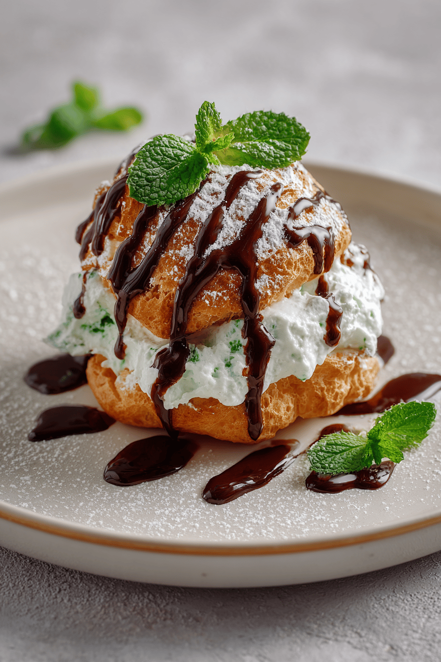Choux pastry filled with a mint-infused whipped cream, topped with a dark chocolate-espresso sauce. Adjusted quantities throughout with a peppermint tweak. Ingredients swapped: cream 38% for richness and maple syrup replaces corn syrup for a natural sweetener. Careful timing and observation key to success. Egg wash replaced by milk wash for a subtler crust color. Cooling technique avoids soggy shells. Emphasis on texture, aroma, and visual cues, plus practical substitutions and solutions for common mistakes.