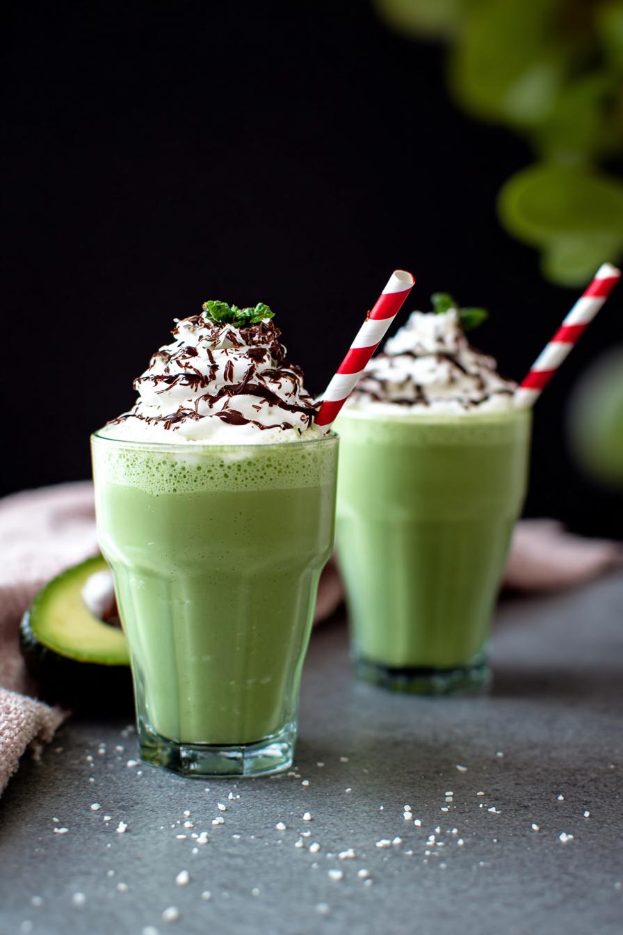 A creamy mint-based beverage with cocoa hints. Uses avocado and spinach instead of ice cream and syrup. Fresh lime juice brightens flavors; pumpkin seeds add crunch. Quick blend, no cook needed. Whipped topping optional but recommended. Cocoa nibs get replaced by chopped dark chocolate or cacao powder. Serves small batch, drink cold. Adjust mint leaf amount to avoid bitter taste. Avocado gives smooth, rich texture without dairy. Spinach is subtle, adds color and nutrients. Lime keeps it fresh and tangy. Blend sounds thrum steadily. Pour when texture is velvety, not watery.