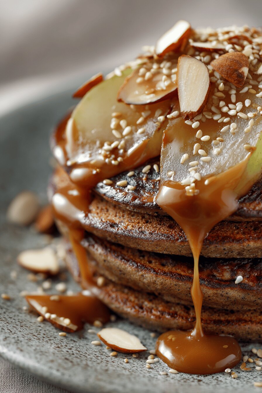 - Stack pancakes on plates. Dollop mascarpone atop each stack; mascarpone adds creamy tang, counterbalances sweetness. Arrange spiced pears alongside or atop mascarpone. Generously drizzle warm miso caramel over pancakes and pears. Scatter toasted almonds and sesame seeds for crunch and nutty aroma.