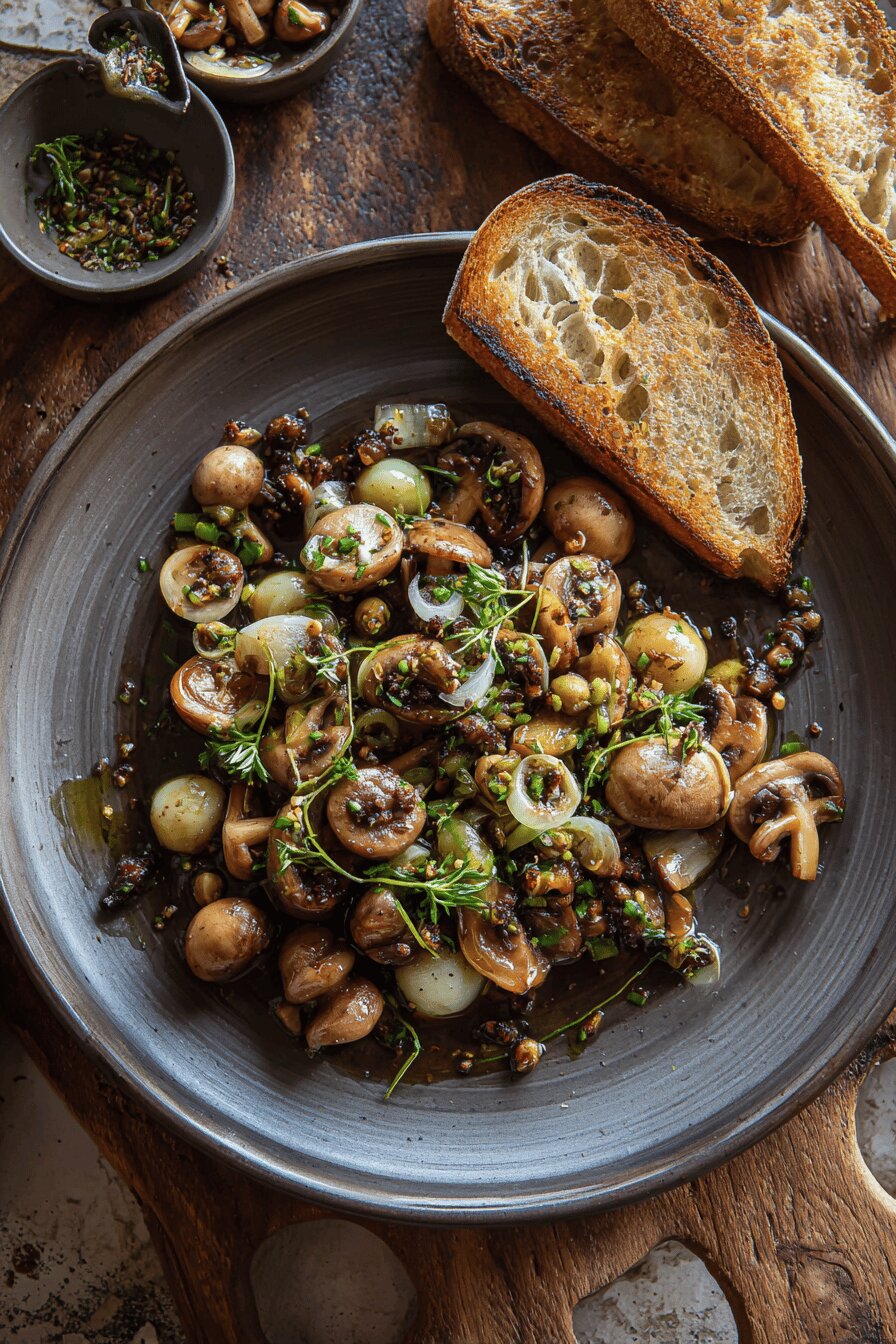 Pearl onions and mixed mushrooms sautéed with mustard and fennel seeds, deglazed in sherry vinegar, tossed in walnut oil. Chilled 1.5 hours. Serve room temp alongside rustic bread or charcuterie. Earthy, tangy, herbal. Uses pleurotes and porcini mushrooms replaced by cremini and oyster varieties. Balanced acidity, subtle crunch from seeds. Classic French technique simplified for home cooks. Adaptable, vegan, gluten and nut free when swapped accordingly.
