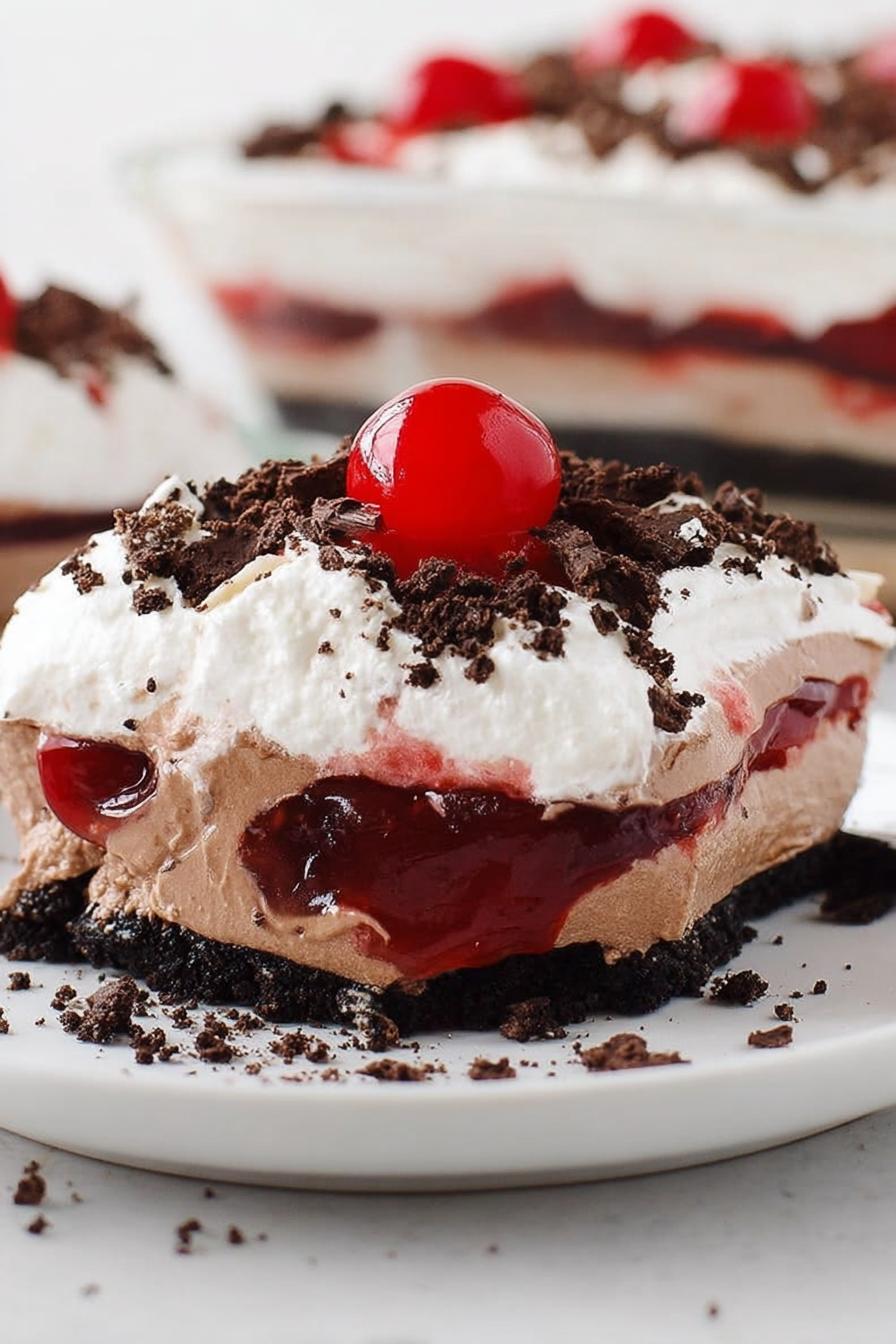 Crust crushed Oreos with melted coconut oil replacing butter. Cream cheese meets powdered sugar, dark cocoa powder swapped for Dutch-process cocoa, vanilla and half-and-half smooth the mix. Cherry pie filling changes to raspberry preserves for tang. Layers chilled slightly longer to set better. Whipped topping smoothed, piped swirls, topped each with dark chocolate shavings and fresh raspberries instead of cherries. Texture plays a big role; firmness guides layering, chill between each step. Sweet, rich, not sickly; chocolate bitterness balancing fruit tartness. Oreo crust firm yet crumbly; cream cheese layer whipped enough for loft but stable; piping done on firm but soft surface. Freeze for 2.5 hours or until fully firm for clean slices.