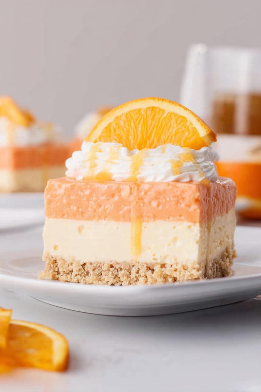 Layered no-bake cheesecake with a zesty twist. Vanilla cookie crust pressed firm, chilled quick to hold shape. Orange gelatin softened then folded into whipped cream for a light, airy tang. Cream cheese beaten till velvety; sugar and vanilla folded in slowly. Two whipped cream bowls split—half whipped into jello, half into cheesecake. Layers built strategically: crust, dense cheesecake, random dollops of orange cream, swirled carefully with fork, topped with remaining cheesecake and creamy orange layer. Chill long enough for structure. Served chilled. Rich, bright, balance of creamy sweetness and citrus pop. Mod adjustments include substituting butter with coconut oil, and orange jello with mango lime for unexpected tropical punch.