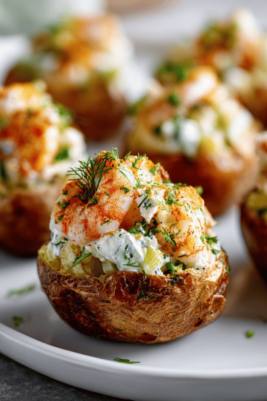 Start by heating oven correctly. Wrong temperature kills texture. Toss potatoes to coat well but not drowned in oil which affects crisping. Multiple tosses during roasting evenly brown potatoes. Roast until poke test shows fork enters cleanly without resistance, indicating fluffy interior. Mix cheese and creme fraiche off heat to control texture; cheese should not be melted or warm or filling will separate. Fold shrimp gently keeping pieces intact for texture contrast. Cut potatoes carefully not to pierce through skin or they leak steam. Press potatoes gently to open crease, don’t pulp or mash; skin serves to hold filling. Fill immediately to maintain heat contrast; filling cold against warm potato gives textural interest. If plating ahead, roast potatoes and prep filling but fill last minute to avoid sogginess. Garnish smoked paprika lightly; overdoing masks all else. Parsley or chives finish visually and with fresh bite. Leftover filling adaptable for dip with pita or crackers. Keep knife handy for last minute scoring and precise onions/fennel dice.