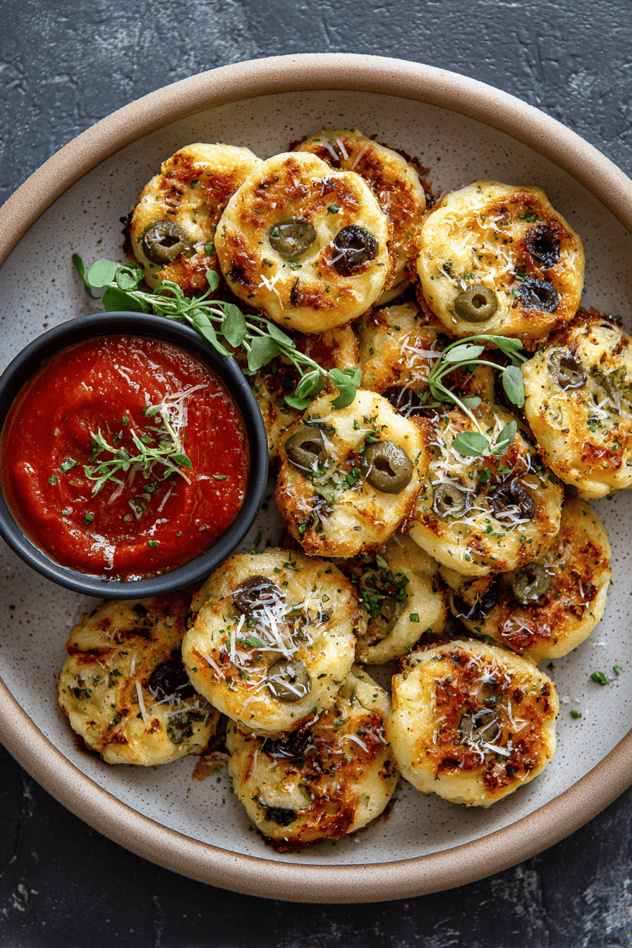 Small focaccia rounds made in a waffle iron. Uses store-bought or homemade pizza dough with olives and cheese. Cooked until crispy golden crust with infused herb and spice notes. Fast to prepare, hands-on pressing for texture. Serve with warm tomato dip or plain. Simple savory snack or appetizer.