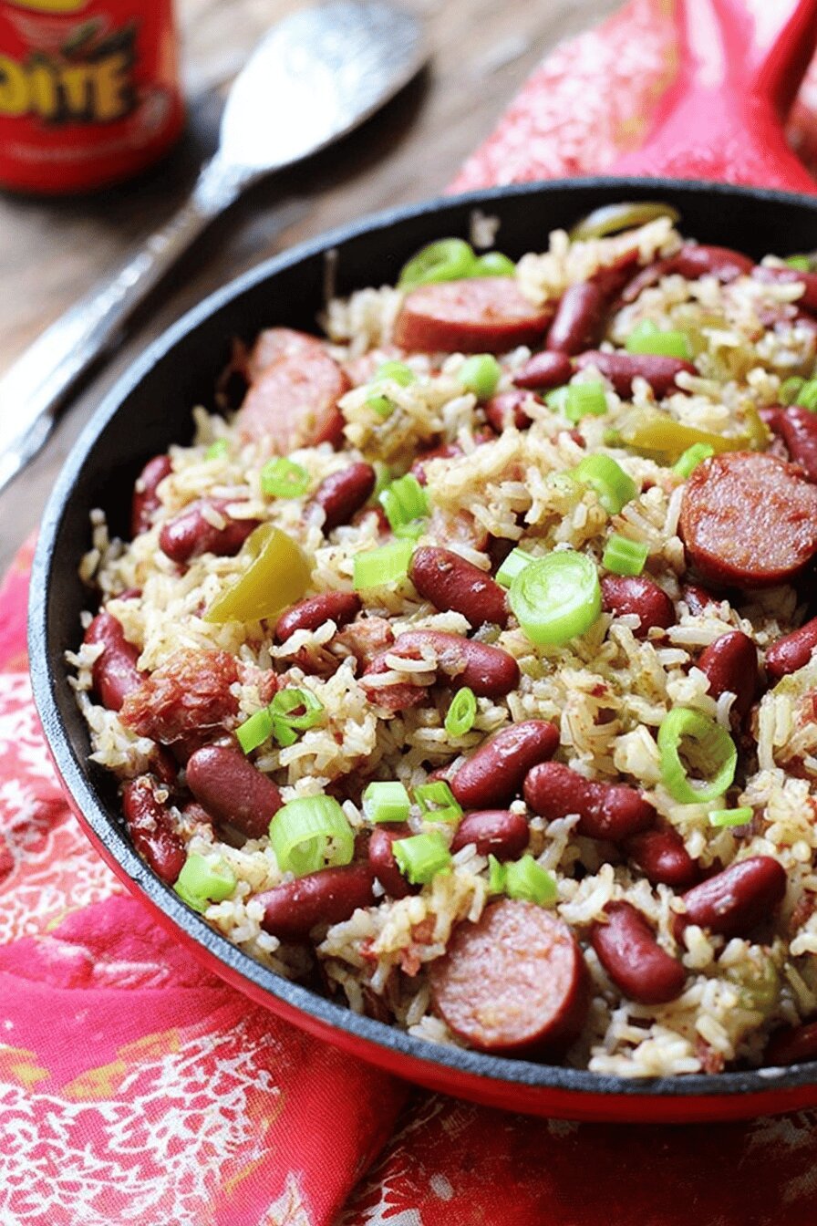 A quick one-pot meal combining sausage with vegetables and rice simmered in broth and Creole spices. Sausage browns releasing fat, veggies soften to translucent, garlic punches aroma. Broth boils, beans and rice join for slow simmer until rice swells and tender. Substitutes for sausage or spices given. Timing and visual cues focus over strict clocks. Practical tips on managing sticky rice, seasoning balance, and handling beans from cans or dried. Slightly adjusted cook times and ingredient amounts for better texture and flavor depth.