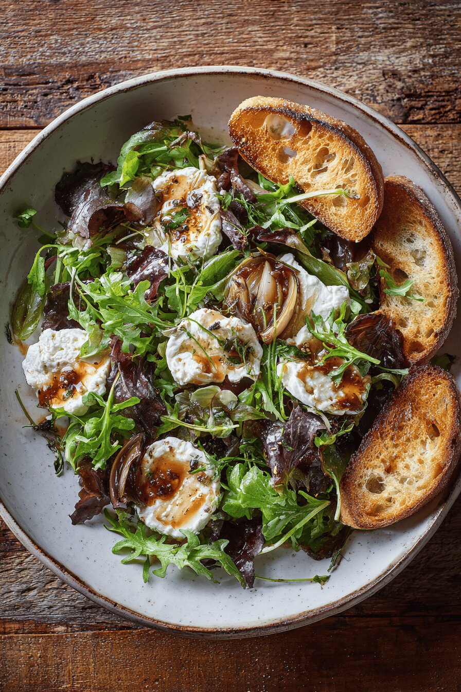 Sweet rings of lightly charred shallot, soft and yielding, tint the plate. The scent of olive oil mingles with the sharp earthiness of goat cheese cut into thin slices. A lively mesclun mix dressed in a tangy vinaigrette with subtle umami notes. Crunch from crostini toasted until golden delivers a contrast. Preparing this salad demands attention — don’t let the onions steam or overcook; you want gentle silkiness with caramel hints, not mush. The vinaigrette replaces sugars with maple syrup; acid swap from balsamic to sherry vinegar shifts the whole profile. Textures matter here: soft cheese, tender greens, crisp bread, melting shallots. A salad but layered with intention.