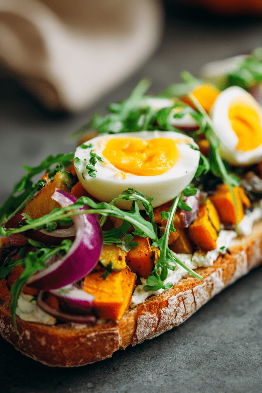 Vegetables charred and softened. Eggs soft-centered. Bread sturdy but soft inside. Aioli. Harissa spice. Kabocha instead of butternut. Sweet potato takes the place of russet. Yellow pepper brightens instead of red. Roasting longer—aiming for more browning. Eggs simmer a tad extra, for deeper set yolks, no runny mess. Ciabatta swapped for baguette for more chew. Layering is open-faced, rustic, no fuss. Arugula adds that peppery note. The kind of making that waits in the kitchen oven, then you assemble fast. Aioli, not mayo, garlic brings a punch. Simpler steps, more time to savor the process.