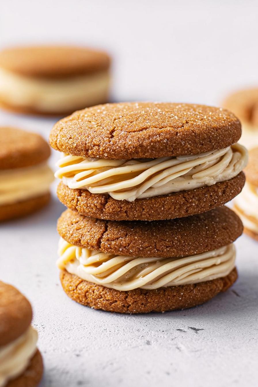 Dark, spicy molasses cookies rolled in sugar, baked until edges crack but centers stay soft. Sandwiched with fluffy cream cheese filling, subtly sweetened and brightened with white chocolate and vanilla. Slightly shorter bake time to keep chew. Orange zest adds unexpected brightness. Swap cloves for cardamom; brown sugar swaps for coconut sugar for earthiness. Dough dough balls no bigger than an inch; spread happens in the oven—space generously. Cooling briefly on the tray helps cookies set before moving. Melt white chocolate gently, cool fully for fluffier filling. Pipe filling using medium nozzle. Sandwich, optional drizzle, sprinkles if mood strikes. Avoid overmixing flour to prevent tough crumb.