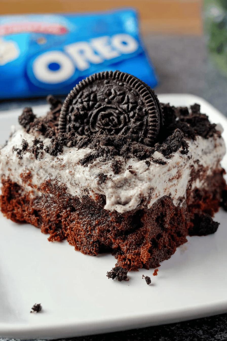 A chocolate cake base with holes poked deep for a thick, creamy vanilla pudding infused with crushed sandwich cookies. Uses a rich cocoa cake mix swapped with malted chocolate powder and evaporated milk for moisture. Poking while hot traps liquid pudding, melting into the crumb for texture contrast. Crushed cookie topping adds crunch, set chilled enough to hold form but soft at edges. Substitutions include buttermilk for milk and homemade pudding from scratch. Timing cues focus on cake spring back, pudding viscosity, and chilled firmness. Notes on avoiding sogginess, ensuring even crushing, and sealing freshness included.