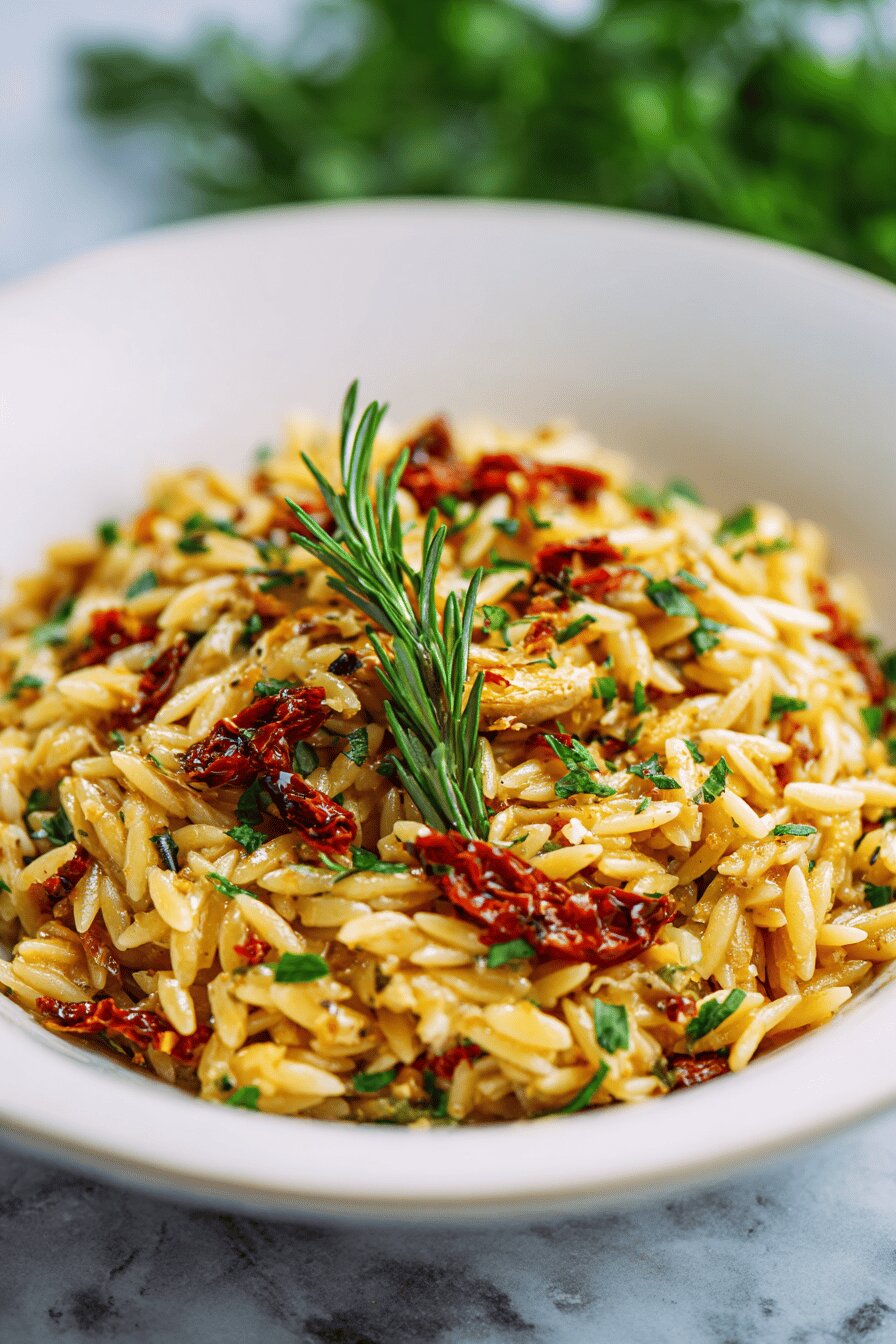 Small orzo pasta tossed with finely chopped sun-dried tomatoes, shallots, garlic, chicken broth, and fresh herbs. The sun-dried tomato oil creates a rich sauce base. Cook pasta al dente to avoid mushiness. The broth reduces and concentrates flavor while the herbs add freshness. A simple, humble grain dish that works as a side or light main. Easily adapted with vegetable broth or fresh tomatoes if needed.
