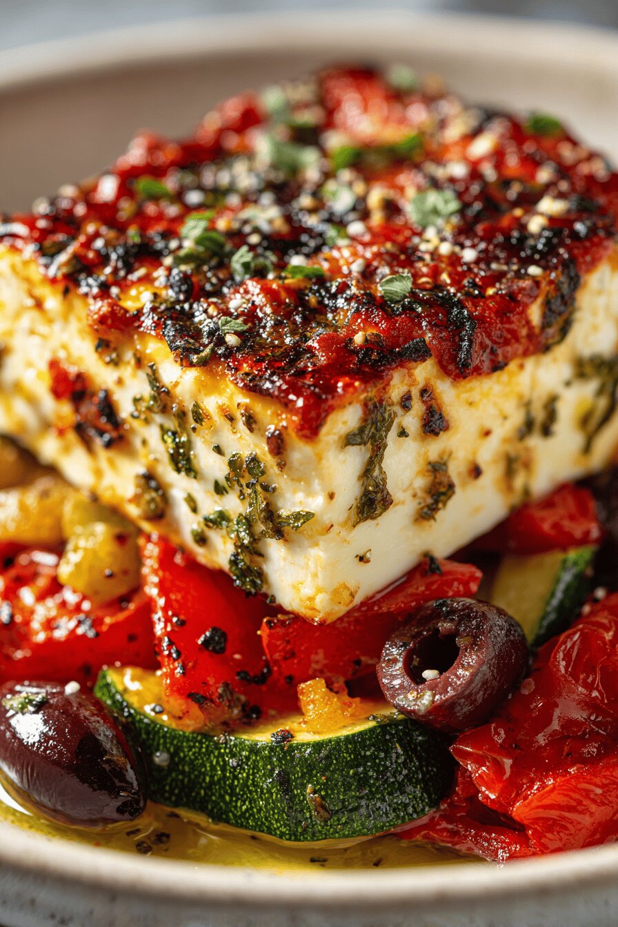 Baked feta cheese with colorful vegetables and olives, oven-roasted at 210°C. Uses red pepper instead of green and adds sliced zucchini for a fresh bite. Olives swapped to black Spanish variety. Mix of herbs includes dried basil replacing oregano. Feta slices soaked briefly in cold water to reduce saltiness. Vegetables marinated in olive oil before layering. Roasted 22 minutes until bubbly and golden edges. A savory, warm vegetarian dish. Nut-free, gluten-free, egg-free.
