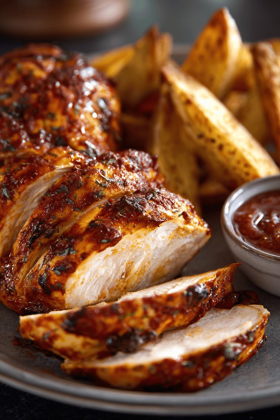 Salt sits on the chicken skin. Slowly pulls moisture out. Wait two days. Not a quick soak. Butter with heat replaces ketchup. Smooth, spicy. Under skin. Not just on top. Smoke in the paprika and cumin. Maple in place of brown sugar, deeper notes. Oven set low, longer bake. Juices baste, keeps chicken juicy. Parsnips roasted not potatoes. Different crunch. Sidekick sauce smoky chipotle, more fire. Layers, bites with punch. Not ordinary barbecue chicken. Moves with twists and turns.