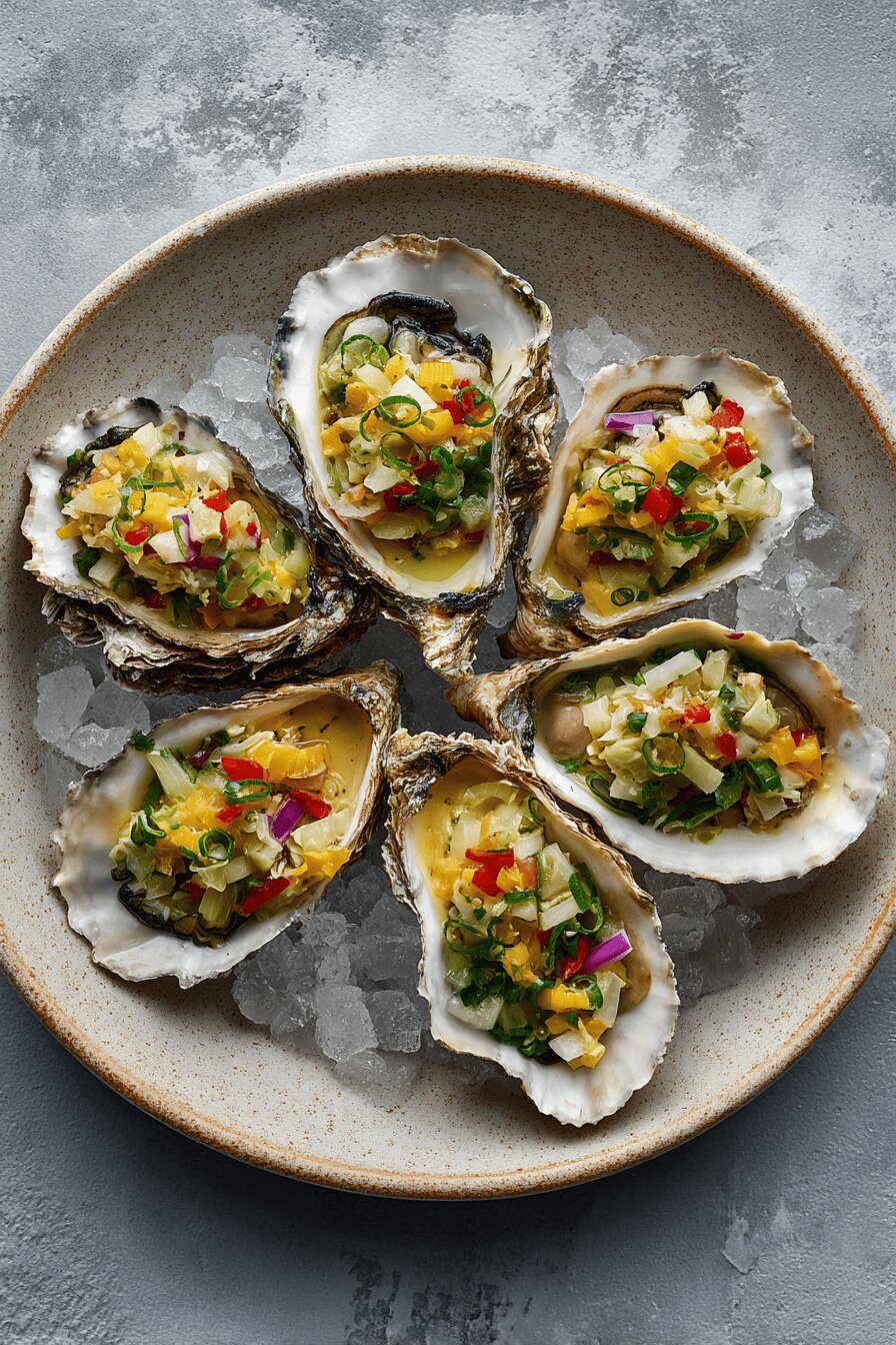 Cold oysters dressed with a tangy, creamy remoulade made from diced kohlrabi and pickled jalapeños, balanced with a lemon-tarragon mayonnaise base. Sharp, bright, with a touch of heat. Opens with a crisp, fresh crunch from vegetables, followed by briny, tender oysters chilled over crushed ice. Simple, just under an hour prep with 2 dozen oysters. Dairy-free, nut-free, gluten-free. Techniques focus on timing, texture contrasts, and shellfish handling.