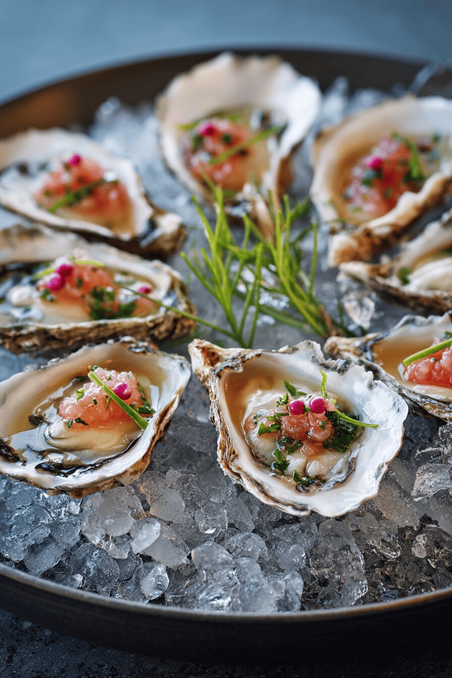 Fresh oysters served chilled on crushed ice with a tangy mignonette made from blood orange zest, lime juice, and shallots. The citrus adds brightness, balancing the ocean flavor. Garnished with bits of segmented grapefruit and a touch of cracked pink peppercorns. A light, refreshing starter that pairs well with bubbly or an Aperol Spritz. Practical tips for shucking and keeping oysters cold included. Variations for lemon or tangerine zests suggested. Simple, no-fuss plating relying on tactile freshness cues.