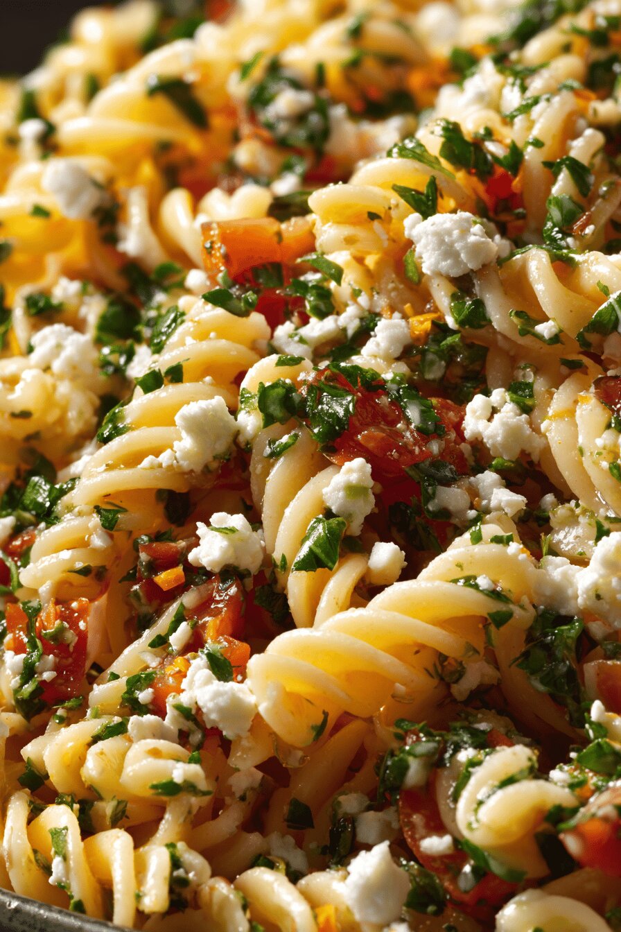 Fusilli replaces original pasta to give tighter curls for gremolata to cling better. Parsley remains flat-leaf, chopped finely for greener notes. Garlic swapped for a mild shallot minced very small for soft onion flavor without harshness. Three zests stay: orange, lime, lemon but emphasize smaller amounts so no overpowering bites. Tomato diced small, seeds removed to avoid wetness that can drown pasta. Juice fresh lemon for acidity, combined with olive oil to emulsify gremolata bits. Parmesan out, feta crumbled in: saltier, creamier chunks contrast fresh herbs. Chives tossed in finely, adding onion nuances but light. Salt and pepper essential to adjust the brightness and savory tone just before serving. Olive oil is good quality; drizzle cautiously to not over-oil the salad or make it greasy. Whole gremolata mix is loosely saucy but more like a chunky herb paste. Everything fresh. No nut inclusion keeps allergy safe. Not lactose free without swapping feta for vegan alternative or omitting cheese altogether.
