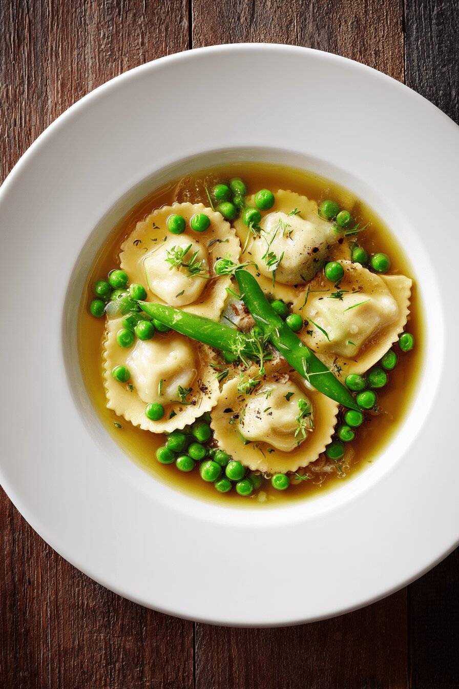 A rustic soup featuring soft ravioli cooked separately to maintain texture. Onion sweated in oil until translucent releases sugars for depth. Deglazed with optional brandy adds subtle warmth; broth brightened with honey balances richness. Frozen peas introduced late keep their snap and fresh color. Salt and pepper adjusted at the end depending on broth strength. Garnished with drizzle of peppery olive oil. A quick, comforting bowl that respects ingredient integrity and timing to avoid mushy pasta or dull broth.