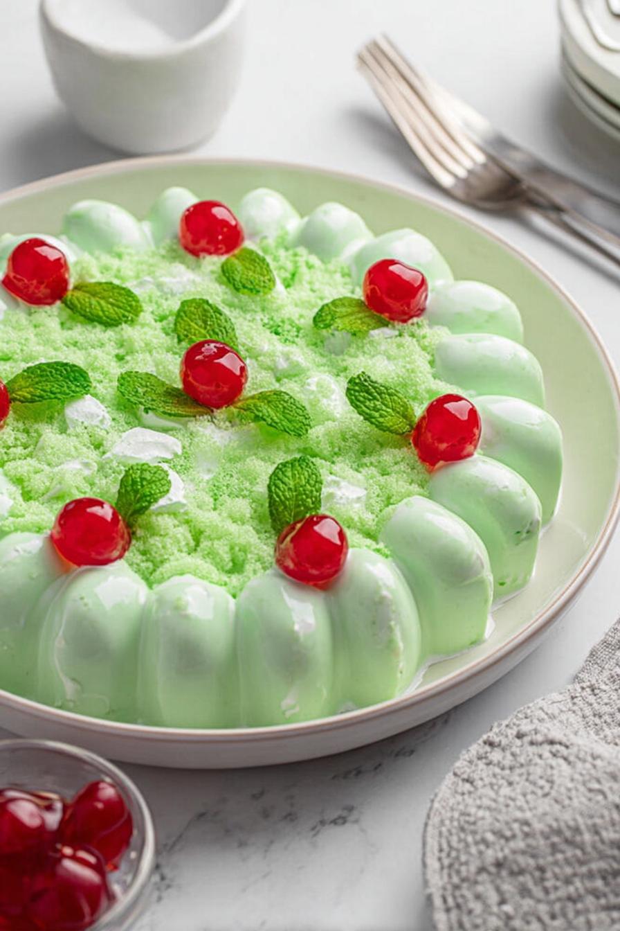 Pear juice weak in quantity usually, top up with water until full cup measurement. Warm gently—not rolling boil—small bubbles, steam visible, good indicator for gelatin powder dissolving. Lime gelatin preferred for brighter acidity, alternative lemon gelatin works too for subtle change. Mascarpone chosen here instead of cream cheese, less dense, richer and easier to whip resulting in creamier matrix. After mixing gelatin in, wait until it thickens to pudding consistency but not firm gel or brittleness—almost jiggle stage, tactile feel important. Mashed pears fold into whipped cream gently using spatula to keep airiness intact. The folding preserves volume rather than destroying it like stirring. Chilling in sprayed molds ensures firm setting without sticking; unmolding needs a warm water rinse around edges—if skipped gelatin sticks even in silicone molds. Timing flex by few minutes is fine but key is watching gelatin consistency not clock. Serves seven, ideal for retro style salads but modernized for smoother texture and brighter citrus flavor. Garnish with classic whipped topping and cherries offers a nostalgic finish but not required. Balance between tart lime, sweet pear, and creamy luscious mouthfeel is at heart of this dish. Cooling and setting stages crucial for final tension of gelatin; too fast and mixture cracks, too slow and mixture doesn’t firm up.