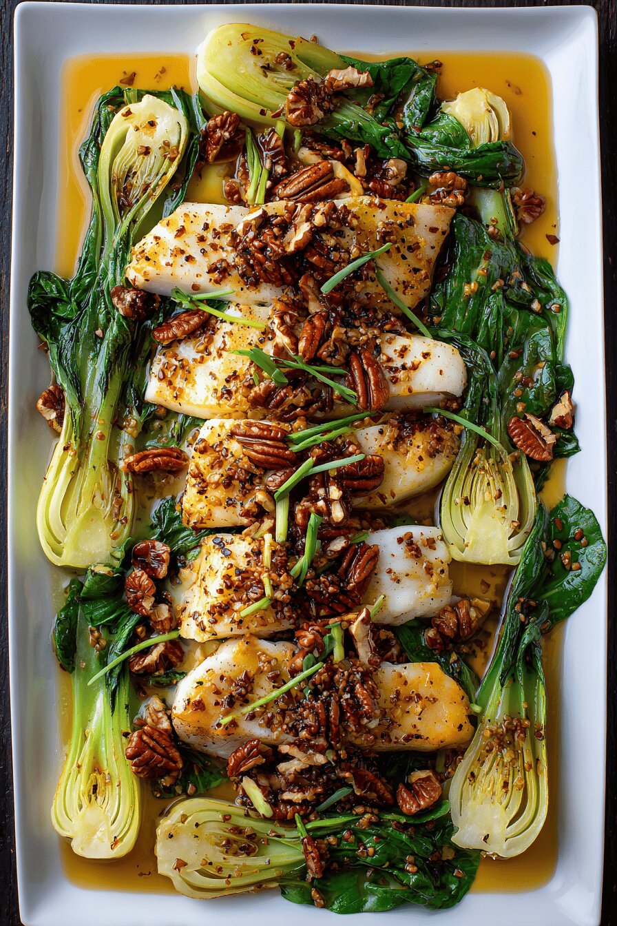 White fish fillets pan-seared with crispy garlic. Baby bok choy wilted al dente, with a nutty pecan crunch. Dressing blends canola and toasted sesame oils with whole grain mustard, fresh lemon juice, and honey syrup. Simple, balanced, without gluten, dairy, eggs. Technique focuses on texture contrast and timing; fish skin removed for cleanliness, bok choy cooked gently to keep crunch. Pecans toasted for aroma and bite. Easy swaps include olive oil for canola, maple syrup replaced by honey or agave. Total cook roughly 35 minutes total, serves 4.