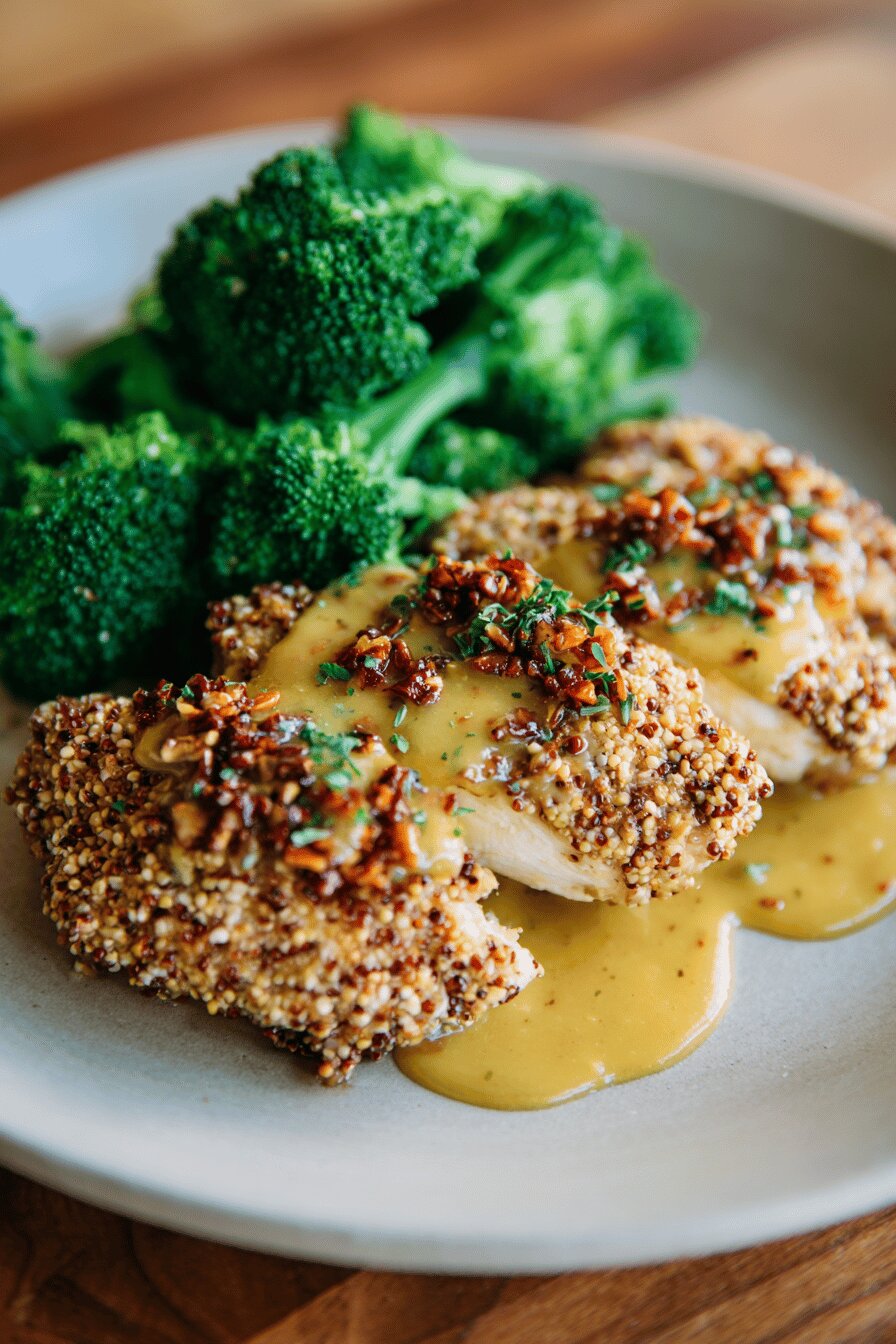 Chicken breast crusted in pine nuts takes a minute but pays off with textural contrast. Apricot jam lacquer sticks nuts and adds subtle sweetness; doesn’t overwhelm savory meat. Searing the fleshy side first sets rendering and color, preventing soggy crust. Broiling is purely to crisp the nut layer last—watch it. Sauce is pan flavored with shallot instead of harsh onion, grainy mustard to counter sweetness and add bite. Butter finish stabilizes emulsions for shine and silk. Broccoli steals some greenery and crunch; steam to keep bright and slightly firm. Keep timing flexible, rely on sight and touch. Burnt nuts or dry chicken happen fast, adjust on feel. The twist: swap out sunflower seeds for pine nuts to dodge allergens without losing texture. Reducing jam counters the sugar. The mustard variation controls acidity and grain introduces rustic appeal. Learned from kitchen slip-ups: crispy crust traps juices, but only if seared right.