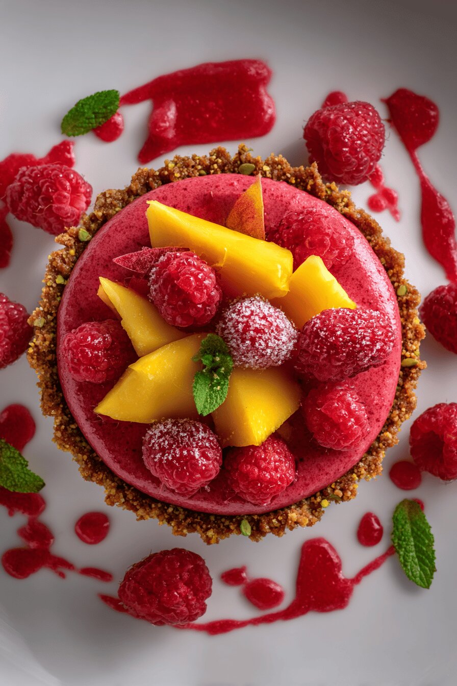 Feel pistachios toasted warm, smell the nuttiness as crust cooks — different from plain butter crust. Pressing almond flour with pistachios adds fat and bite; makes topping sturdy enough to hold moisture from filling. Why mango? Adds textural contrast and subtle sweetness, cuts raspberries tartness. Blooming gelatin is crucial — if rushed or overheated, you lose set. The purée’s temperature matters when folding with cream — too cold gelatin gel traps lumps, too warm melts whipped cream and collapses mousse. Patience—watch surfaces, textures, aromas. Chilling phases not arbitrary; each signals molecular changes. Fresh raspberries scatter unevenly? They compress and shrink; don’t overfill. Folding whipped cream too aggressively deflates air; firm mousse turns dry. The last coulis layer adds brightness, color, balances sweetness. A sharp serrated knife cleans edges, preserves layers. The tart’s texture and flavour develop over hours in fridge. No eggs—stable mousse solely from gelatin and cream, easier but precise. This method works even if fresh berries short. Replace with thawed frozen for no compromise. One slip and mousse splits or curdles — watch temps. Chill, slice, serve. Less fuss than it looks.