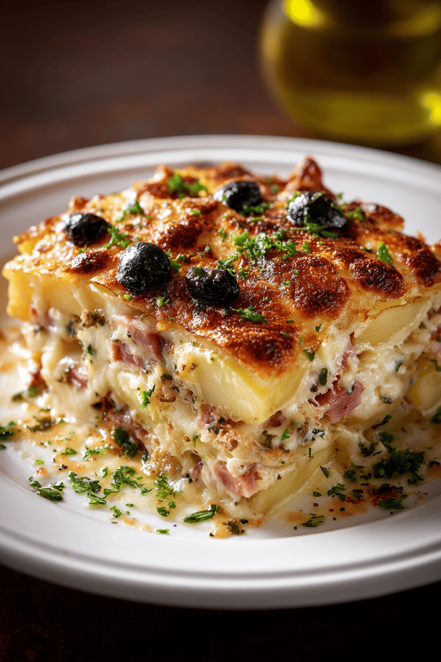 Layered potato and ham gratin with creamy texture and browned cheese top. Uses Yukon Gold potatoes swapped for Russet; smoked Gouda replaces Reblochon for a milder, smoky twist. Onions softened in olive oil, white wine replaced with dry sherry. Slow baking encourages melding flavors, cheese browns with crispy edges. Avoid peeling potatoes too early; retaining some skin adds rustic texture and keeps slices intact. Cream adds richness; opt for 30% fat to prevent curdling. Recipe adjusted for altered quantities and timing, balancing softness and bite. Simple, hearty, classic gratin with modern substitutions.