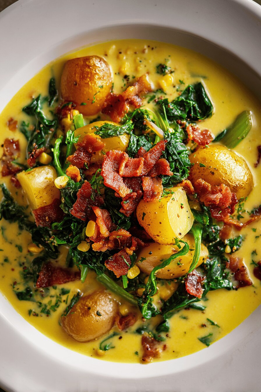 Rich soup blending fingerling potatoes, leek, corn, and warm spices. Simmer gently to soften potatoes and meld flavors. Garnish crispy pancetta and sautéed greens for contrasting textures. Offers vibrant aroma from turmeric and a subtle sweetness with maple syrup. Use vegetable broth to keep it vegetarian or chicken broth for depth. Ideal in cooler months or any time you want comforting nourishment. Adjust seasoning as you go; soup thickens as it cools. Quick to prep, mostly hands-off simmering. Leftovers reheat well with slight thinning by broth if needed.