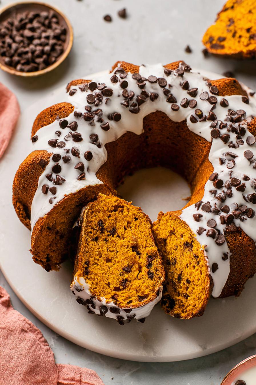 Mid-fall, the kitchen smells like the spicy earthiness of pumpkin stirred into batter. You want moist, not dense. Chocolate chips tucked inside for bursts of melty sweetness. The difference is in the timing and care. Too hot oven scorches the sugars on bundt’s surface, too cold makes it heavy. That sugar and egg whip builds the lift needed to bounce back soft crumb. Sour cream balances moisture and tang sharp enough to cut sweetness but not overpower pumpkin. Think layered textures — frosting thick and chill-counterpoint to warm slice. Greasing that pan well saves frustration later. Tossing chips in flour is classic for pull-up suspension, not sinking to bottom. Using your senses—aroma, sight, toothpick test—always beats the clock. Bundt cakes are forgiving but impatient.