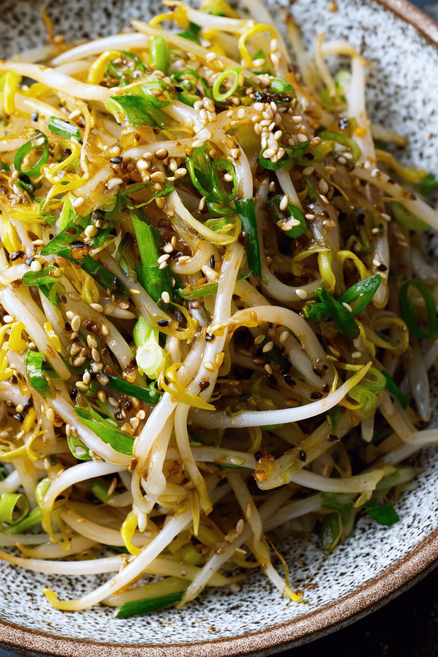 Bean sprouts blanched briefly, tossed in a tangy mix of toasted seeds, rice vinegar, and a quick soy-mirin glaze with a hint of honey. Garnished with scallions for freshness. Simple, fast and vegan-friendly. Ready in about 15 minutes. Low calorie, light side dish or snack.