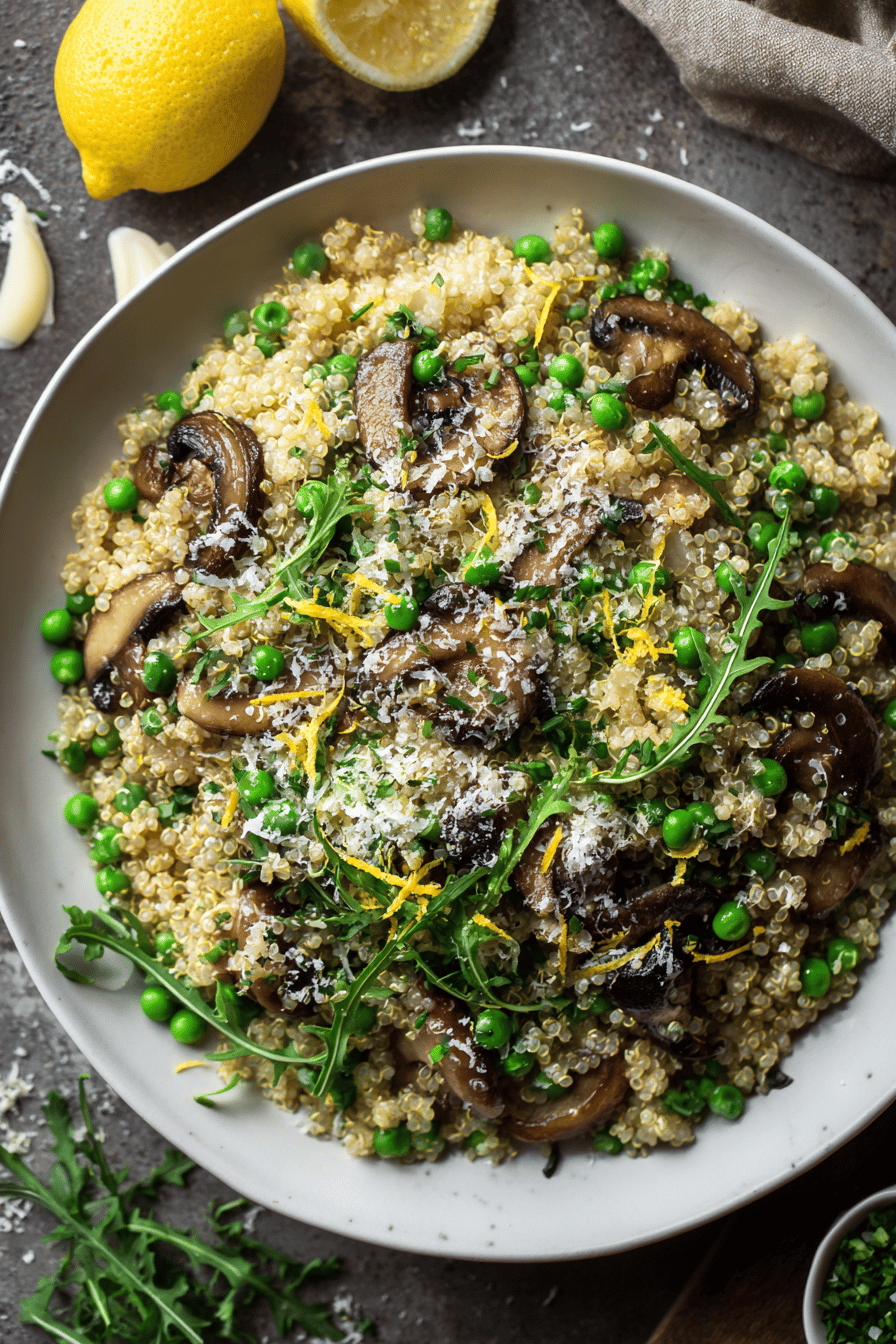 Warm broth mixture gently—no boil, or the cream might separate. Removing thyme sprig before cooking stops bitter over-extraction. Sautéing mushrooms without crowding is crucial; don’t stir too often—let surfaces brown or you lose flavor development and texture. Toasting quinoa is quick, keep stirring to avoid burning. When adding broth, the key is that sizzle and absorption before a new ladle; you want creamy but nutty grains, not mush. Stir often but gently to coax starch without crushing grains. Peas, herbs, zest go in last so they keep vibrancy and texture. Salad dressing: toss just before serving to keep arugula bright and crisp. Final drizzle of olive oil ties it all together. Avoid overcooking or the dish turns gluey. If in doubt, taste grain firmness and texture—should have slight chew still. Adjust seasoning at end, the vegan Parmesan adds salt and umami punch.