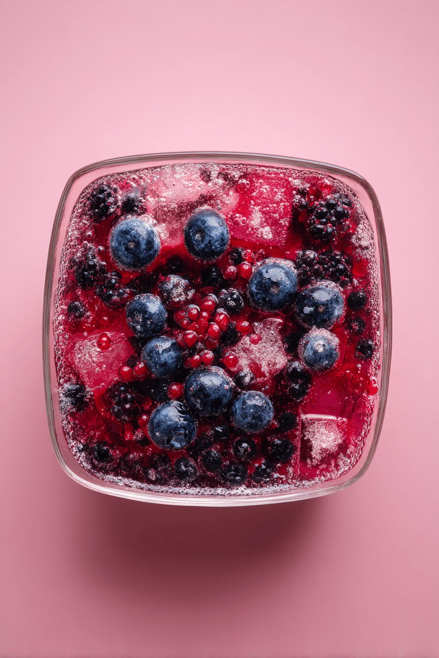 A syrup combining water, cane sugar, and a mix of chopped berries—blueberries, raspberries, and blackcurrants swapped in. Boiled until bubbling, simmered briefly, then cooled and strained for clarity. A versatile base for drinks or desserts, lasts about 5 weeks refrigerated. Adjust sweetness or berry types as available. Emphasis on watching texture and aroma changes to know when it’s ready.