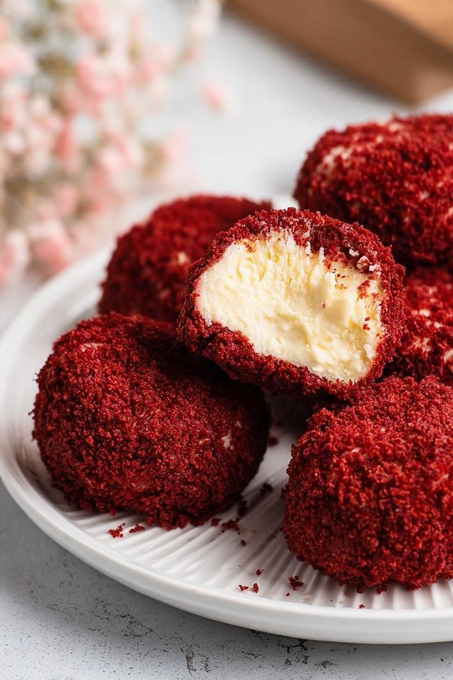 Mini cheesecake balls coated in red velvet cake crumbs with a graham cracker and vanilla cream cheese center. Uses store-bought cake mix altered for texture balance and a chilling step to firm up the balls. Efficient crumb coating method, tips for drying crumbs, and alternative flavor notes. Ideal as bite-sized treats with creamy, crumbly, and slightly tangy contrasts.