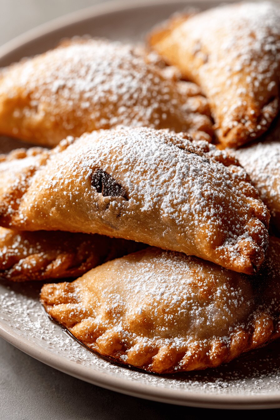 Drain ricotta using multiple layers of cheesecloth for fine texture, and avoid squeezing which can make filling dense. When mixing dough, incorporate wet ingredients gradually into flour well to control hydration and observe dough texture. Kneading activates gluten forming structure; stop as soon as the dough is smooth and elastic. Resting dough isn’t optional; it relaxes gluten network, best results rolling thin and prevents shrinkage in oil. Roll dough in stages, on floured surface, limiting extra flour use on dough to avoid toughening crust. Cut rounds cleanly—jagged edges increase risk of oil seeping in, causing sogginess. Seal edges firmly; a little water acts as glue. Fry in small batches to keep oil temperature stable. Look for bubbles and golden color not just exact time. Drain turnovers quickly on racks or paper towels to absorb excess oil and avoid sogginess. Dusting with sugar while warm allows slight melting and adhesion. Leftovers get softer; reheat in moderate oven to crisp again. Avoid freezer storage—dough and filling don’t reheat well frozen.