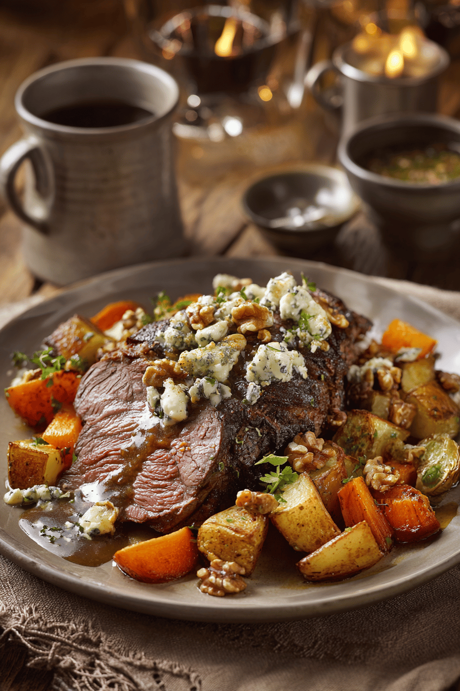 A hefty ribeye roast rubbed with aromatic spices and slow-roasted alongside root vegetables wrapped in foil. The resting phase in a cooling oven lets flavors deepen while juices redistribute. A rich Madeira and pickled green peppercorn sauce thickens to coat the beef. Blue cheese, toasted walnuts, fresh herbs dress the roasted vegetables for contrast. Timing relies on color and texture cues; adjust for oven quirks. Substitutions accommodate availability: sherry for Madeira, pecans for walnuts. Rustic, hands-on method rewarding patience and attention to heat retention and seasoning balances.