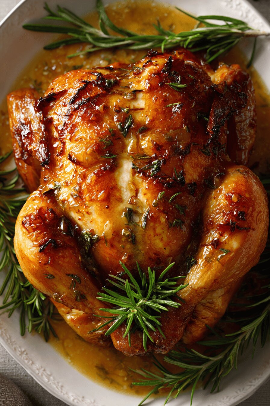 Whole chicken slathered with a butter, apricot jam, and fresh herbs paste tucked beneath the skin. Roast until golden, juices run clear, internal temp 80-85 °C. Pan drippings saved to boost a bright rosemary-orange sauce thickened with cornstarch. A twist on classic marmalade mustard glaze; swap apricot jam for marmalade or peach preserves, rosemary for thyme. Butter swap possible with ghee or olive oil for dairy-free. Cooking cues focus on skin crispness and thigh temperature, not blindly on time.