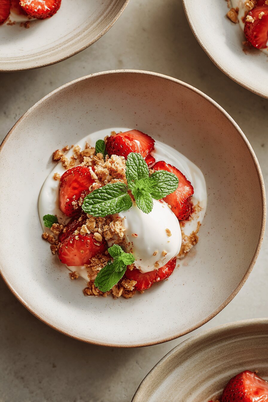 Roast strawberries on middle rack for even heat. Don’t stack or crowd, air circulation key to avoid steaming. Color cues tell when sugars caramelize: amber edges, sticky gloss. Leave berries in switched-off oven briefly; residual heat intensifies flavor without overcooking. Almond crumble needs attention—stir halfway to prevent burning, remove as soon as golden to retain crunch. Whip coconut cream cold, spike with vanilla at start for flavor incorporation. Folding carefully keeps airiness—beats mixing. Assemble last minute; ingredients lose texture fast. Let coconut cream temper before serving if chilled, pliable but firm. Garnish adds freshness and aroma contrast—never skip the mint.