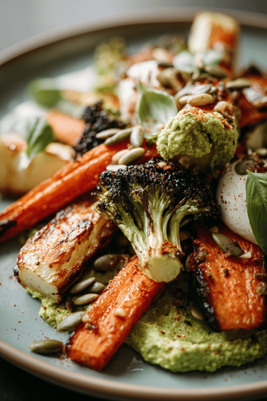 Starting somewhere between caramel-browned veggies and crunchy seeds. Carrots, broccoli, parsnip – sweet, earthy, snapping under slight roast char. Sunflower seeds get a spicy smokey upgrade with paprika; nuts excluded but crunch remains. All layered over creamy avocado-based hummus smooth enough to spread but thick enough to hold heaps of veggie goodness. Smoked mozzarella offsets vegetal sweetness with salt and texture. The brightness of lime juice in hummus, basil tearing on top, fragrance bursts unexpected. Roast high and watch those edges. Boost flavor with charred bits. Timing and temp yield depth; overdo and veg become mushy or dry. Approach with confidence, prep has fail-safes and swaps if running low on ingredients or spice tolerance.